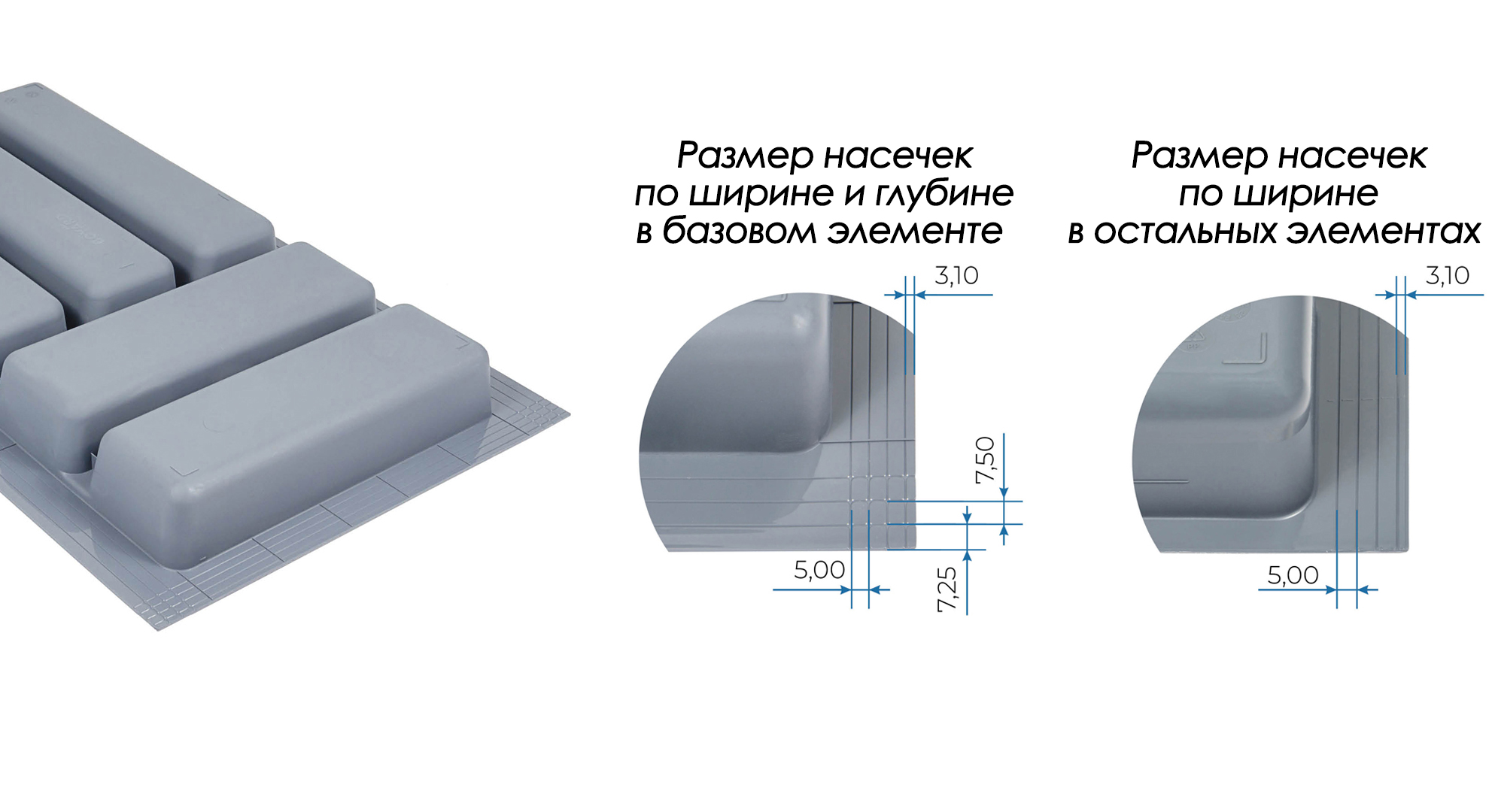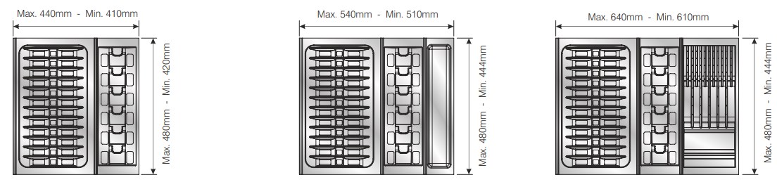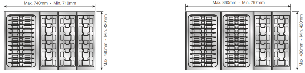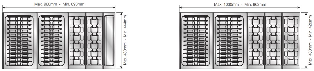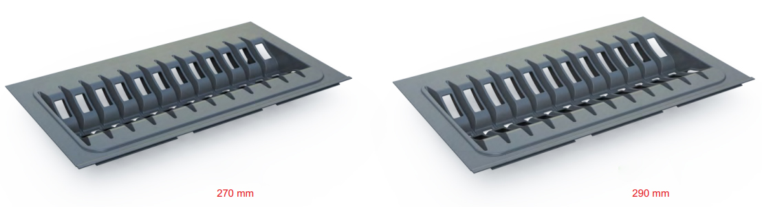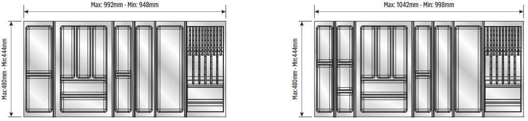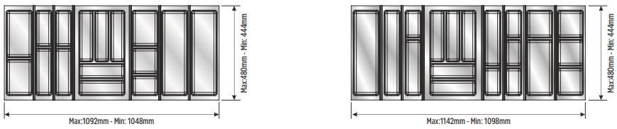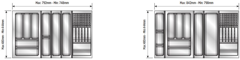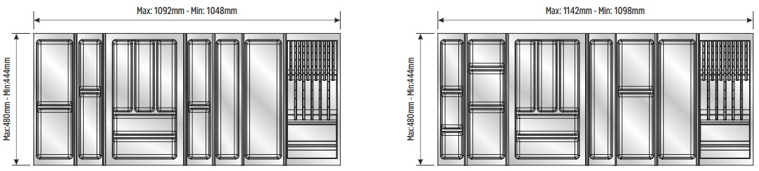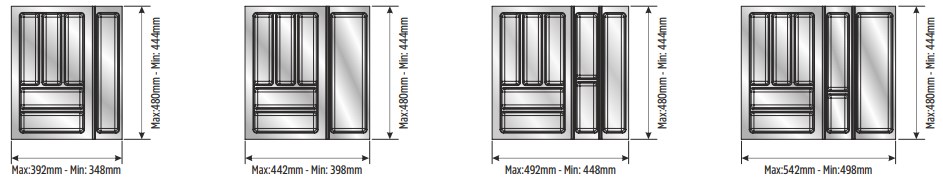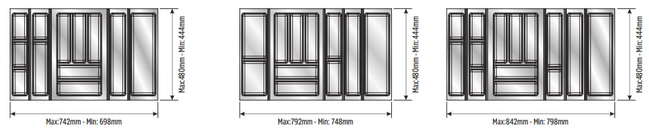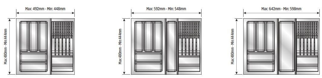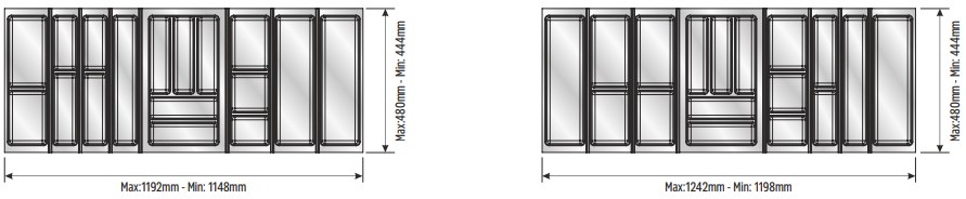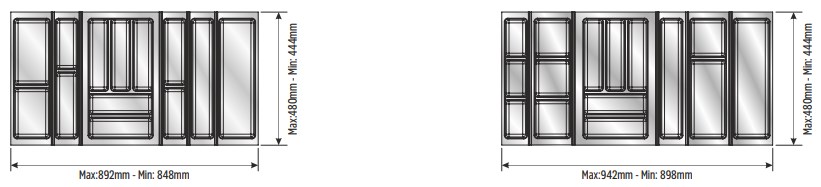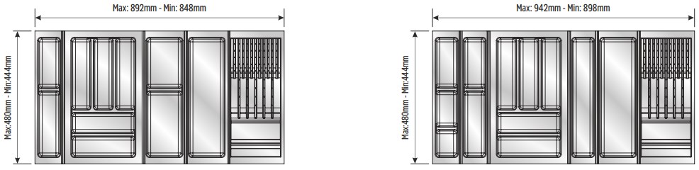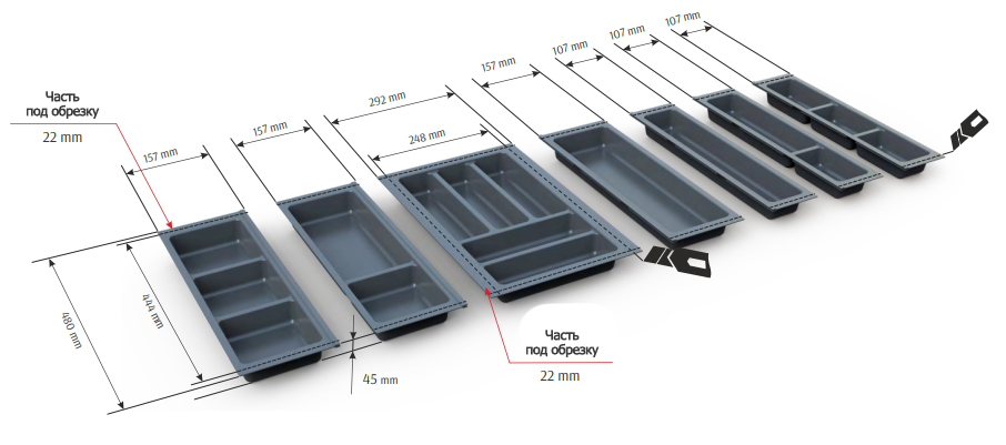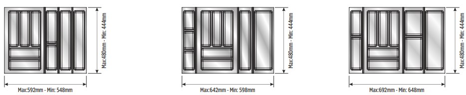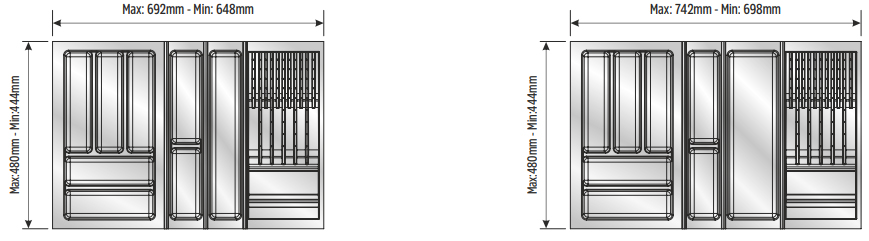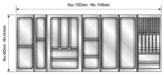 Вкладыши подходят для ящиков глубиной 500 мм. Ширина ящика может быть любой — от 248 мм. Элементы имеют насечки на тыльной стороне, позволяющие подгонять собранный набор вкладышей до нужной ширины. Базовый элемент и вкладыши для тарелок (270х480 мм и 290х480 мм) могут подрезаться как по ширине, так и по глубине; остальные элементы — по глубине.