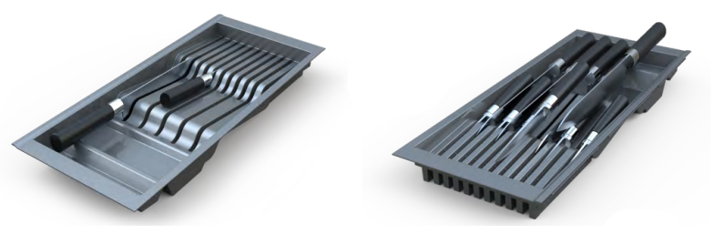 Вкладыши представляют собой конструктор из элементов различной ширины и назначения: от базового элемента для столовых приборов до блока для ножей и тарелок.